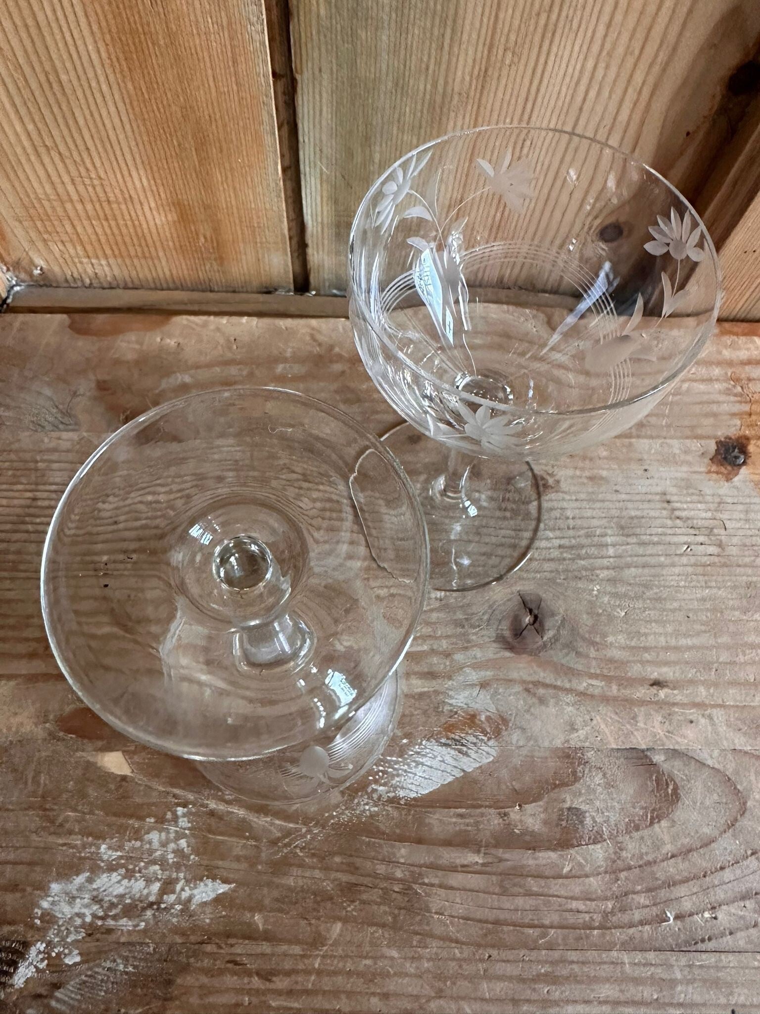 Vintage wijnglazen met geëtst bloemmotief. set van 2. 13,5 cm hoog