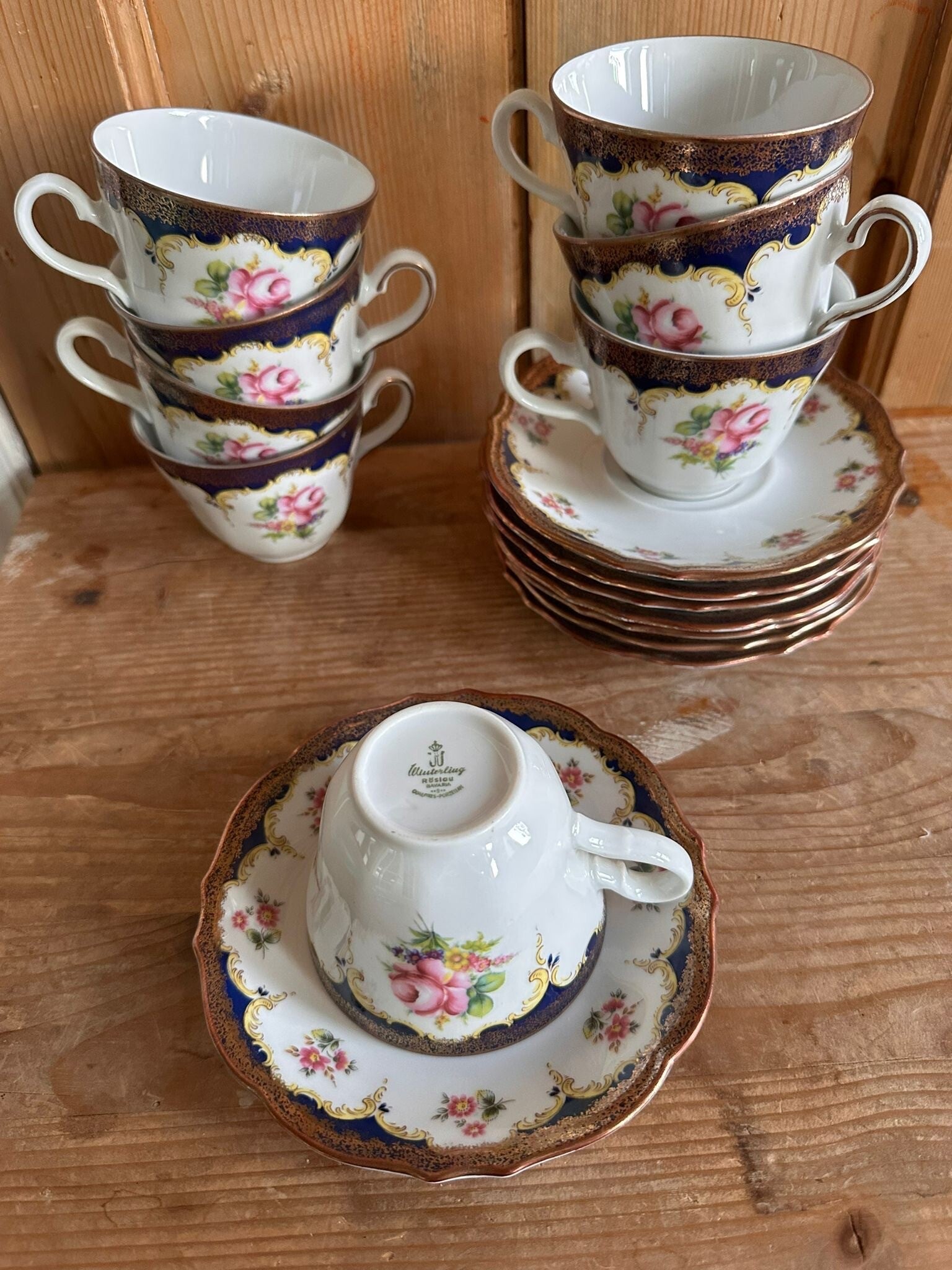 Vintage Winterling Röslau Bavaria Theeset – Moss Rose & Kobaltblauw met Goud 8 Cups en Saucers 1960s Porselein